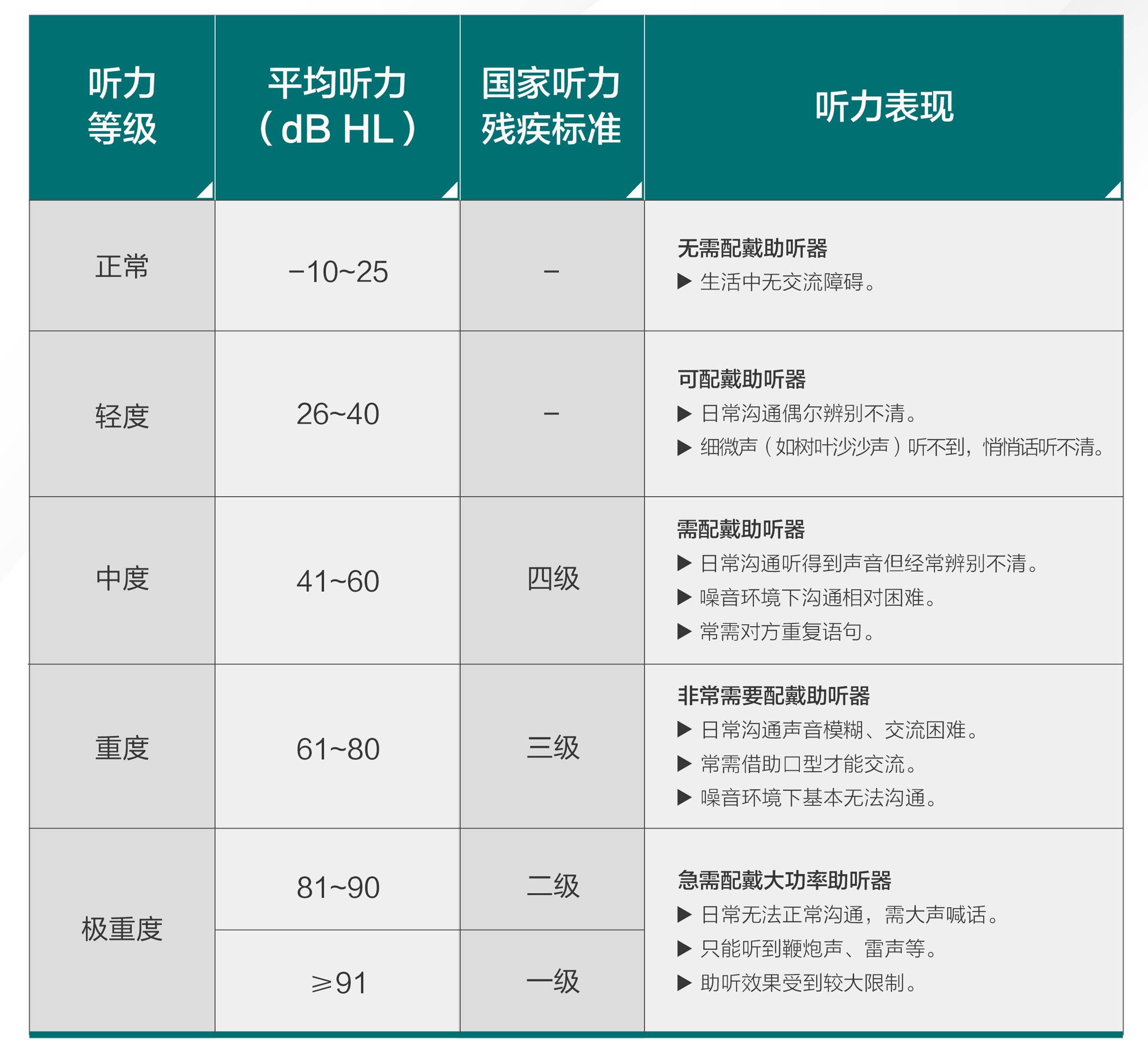 根据听力图上平均听阈水平的声强大小来确定听力水平的级别。听力水平的级别分为:正常听力(-10~25dB HL)、轻度听损(26~40dB HL)、中度听损(41~60dB HL)、重度听损(60~80dB HL)、极重度听损(≥81dB HL)。