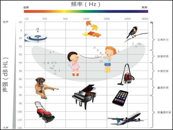 纯音听力图表往往结合言语香蕉图来表示听障患者的听力损失程度和听力损失的位置。例如低频听力正常,而高频听力下降,可能会听得到部分语音,但总会感觉听不清晰。